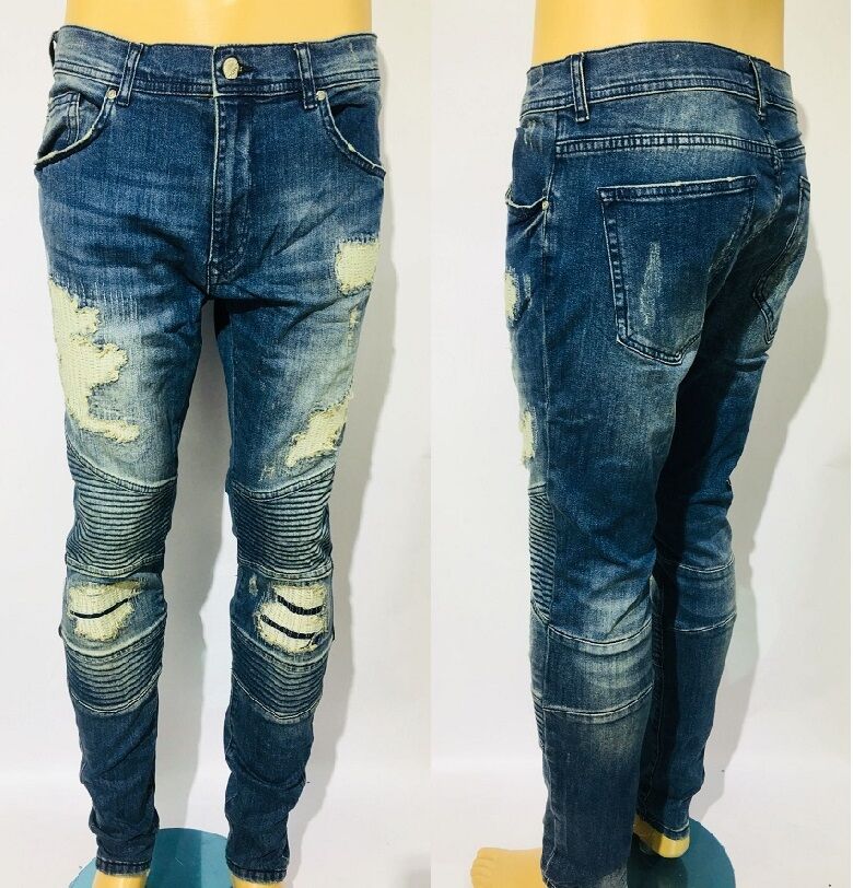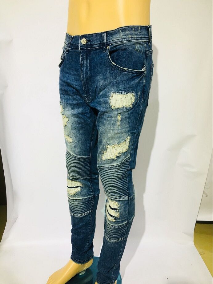Super Cool Men Biker Repaired and Ripped China Denim Slim Fit Jeans In Mid Blue, these jeans are made of high-quality stretch denim fabric, perfect tailoring, cool stylish. wearing these jeans to go for ride, would be awesome!